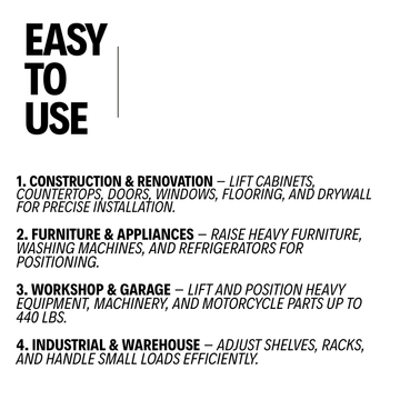 Solid tool and very well built. I used the Herron Hand Jack to lift and align cabinets and doors, and it handled the weight easily. The grip is comfortable, the lift is smooth, and it feels durable. Makes one-person jobs much easier. Definitely worth the price.